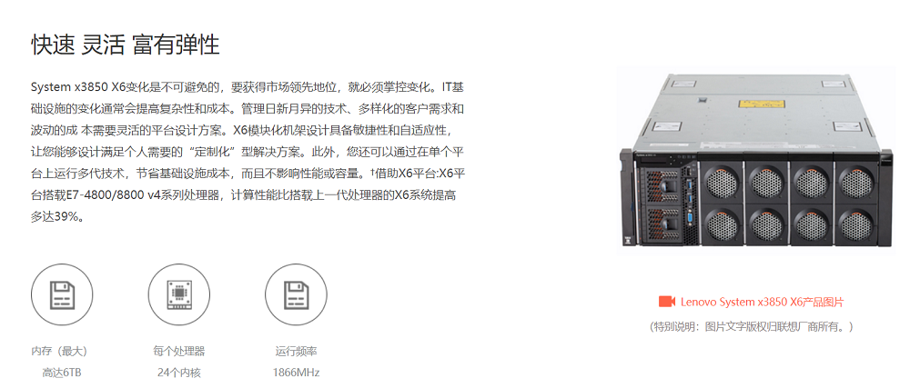 LenovoSystem??x3850 X6 基于第六代企業(yè)級X-Architecture 技術(shù),可幫助您高效地提供更好、更及時(shí)的業(yè)務(wù)成果。X6平臺(tái)搭載Intel ? Xeon? E7-4800/8800 v4系列處理器,計(jì)算性能比搭載上一代處理器的X6系統(tǒng)提高多達(dá)39%。*X6產(chǎn)品組合支持大型應(yīng)用程序虛擬化,并可降低基礎(chǔ)架構(gòu)成本和復(fù)雜性。